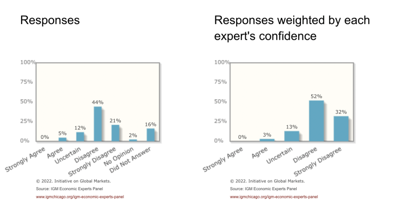 Ponderado por la confianza, un asombroso 84% estuvo en desacuerdo con la idea de que tal plan sería bueno para la economía. Como cualquiera que haya pasado tiempo entre economistas puede decir, son un grupo inconstante con una amplia gama de influencias ideológicas, por lo que este tipo de consenso sobre un tema es bastante inusual.