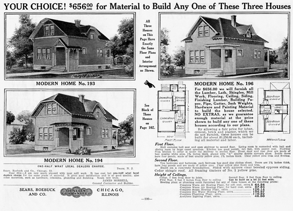 El catálogo de Sears Modern Homes de 1914 muestra tres casas que podían comprarse por 656 dólares cada una (en la letra pequeña, admiten que el gasto total sería más bien de 1250 dólares, incluyendo los ladrillos, el cemento y el yeso, que no suministran, y la mano de obra). Tu casa prefabricada se entregaba por ferrocarril; en general, se daba por sentado que los propietarios serían lo suficientemente hábiles (o sabrían a quién contratar) para montarla siguiendo los planos suministrados.
