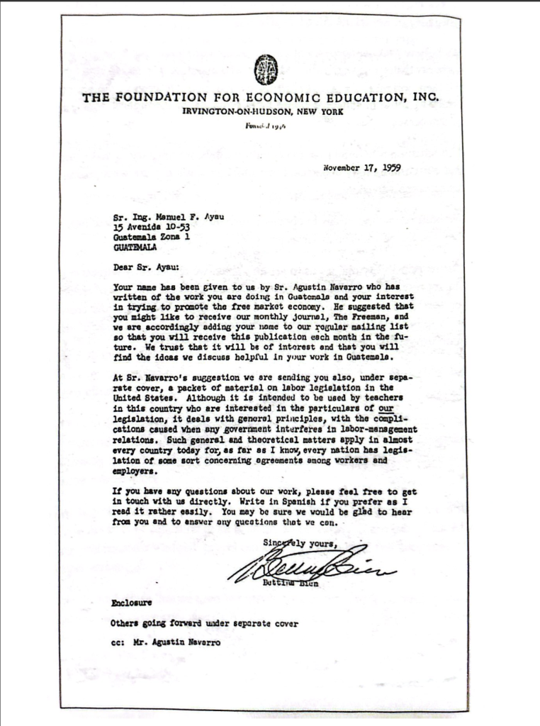 La misma semana, Bettina Bien Greaves, de la Fundación para la Educación Económica, escribió desde Nueva York, ofreciendo apoyo, recursos y aliento a Ayau. Esta carta marcó el comienzo de una asociación duradera entre el grupo de Ayau y FEE. Lo que comenzó como un simple intercambio de ideas se convirtió en una colaboración profunda y duradera, que dio forma a su visión y sentó las bases intelectuales para promover la libertad en Guatemala.