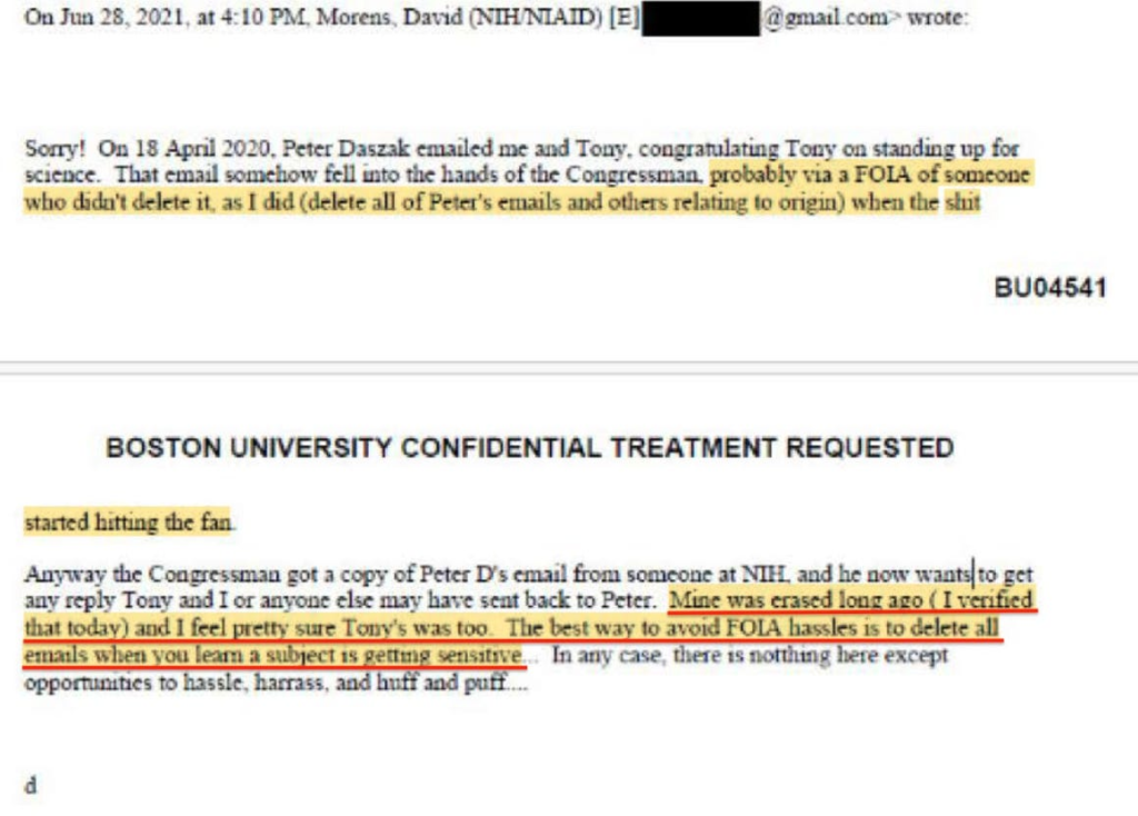 En un correo electrónico enviado en junio de 2021 a un destinatario cuyo nombre no se ha revelado, Morens hablaba de una correspondencia electrónica entre él y Daszak que «borró hace mucho tiempo», y añadía: «Estoy bastante seguro de que Tony también lo hizo».
