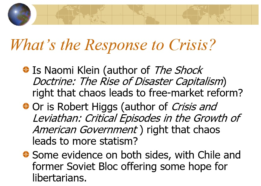 • ¿O obliga una crisis económica a los políticos a reducir el tamaño y el alcance del gobierno, que es la hipótesis de El auge del capitalismo del desastre, de Naomi Klein?